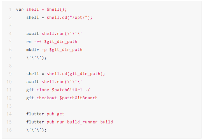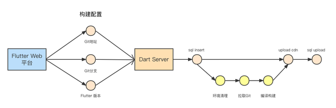 如图所示,自动化上传Fair产物由开发者在Flutter Web平台配置构建信息,转到Dart Server 进行编译处理,根据Web平台的构建配置信息会进行入库操作,把Git地址、Git分支和Flutter版本等与本次创建的Fair资源做关联记录。之后会进行环境清理、拉取填入的GIt项目地址到服务器,执行flutter pub get和flutter pub run build_runner build命令生成Fair产物,关键脚本如下: