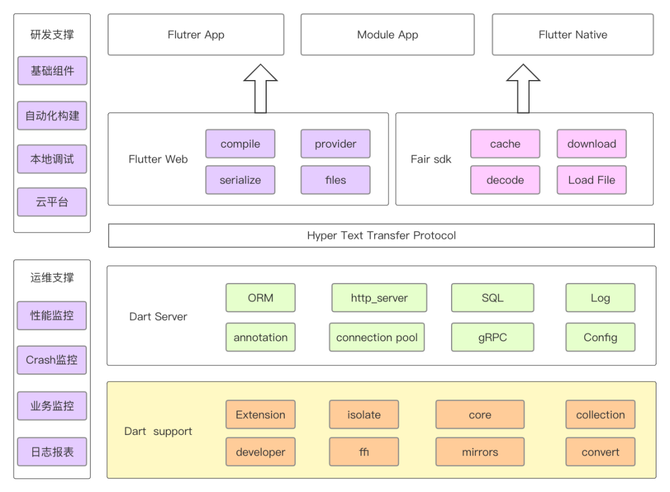 整体设计是以Dart语言为支撑,Dart语言是面向对象的,特点和平常用的语言有类似的语法、运行时环境变量,可以运行在浏览器、dart虚拟机和移动设备上。并且同时支持 JIT(Just In Time,即时编译)和 AOT(Ahead of Time,运行前编编译)的语言之一。上图的FairPushy大致可以分为四个方面如下: