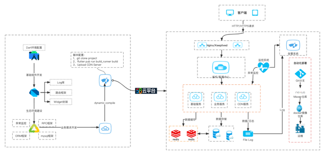 3. Flutter Web和Fair Sdk:Flutter Web提供Fair产物的打包上传、环境切换和动态化编译功能,Fair SDK主要负责Fair资源产物的下载、缓存和加载功能