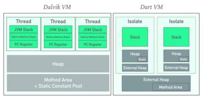 Dart是单线程执行,也就是说一旦Dart函数开始执行,就会一直持续直到结束,Dart函数不能被其他Dart代码中断。不过Dart可以通过 async-await、isolate 支持并发代码编程。Dart 代码并不在多个线程上运行,取而代之的是它们会在 isolate 内运行。每一个 isolate 会有自己的堆内存,其各自的GC不会影响到其他isolate的,从而确保 isolate 之间互相隔离,无法互相访问状态。由于这样的实现并不会共享内存,所以不需要担心 互斥锁和其他锁。所以我们可以通过把用内存空间较大且生命周期较短的接口放到isolate中,这样即使另外一个isolate GC了并不会对我们正常的业务流程造成影响。