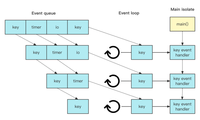 在使用 isolate 时, Dart 代码可以在同一时刻进行多个独立的任务,并且使用可用的处理器。Isolate 与线程和进程近似,但是每个 isolate 都拥有独立的内存,以及运行事件循环的独立线程。Event queue能够确保同时处理多个任务。event loop的工作就是从event queue内拿一个event然后处理它,一直重复这个操作直到queue里全部处理完毕。event queue内的event有可能是文件I/O、timers等等