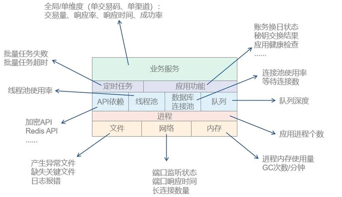 交易成功率/响应率/交易量/响应时间:此类指标为联机交易类应用系统的通用指标,通过从容量、延迟、错误3个维度度量应用服务健康状态。需要关注的是可细分为多个维度,如全局指标/单交易码、渠道、商户、系统返回码/业务返回码等,通过维度+指标组合分析发现和定位应用系统交易的异常。