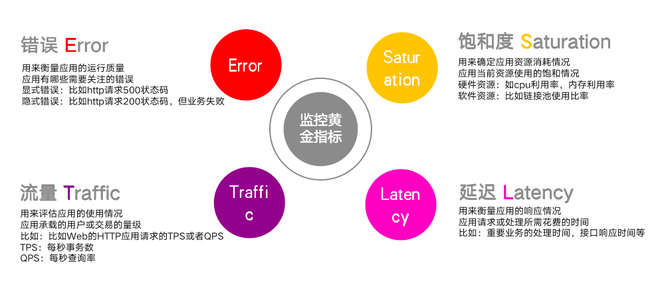 在监控指标选取方面,G行参考Google提出了黄金指标概念,具体内容如下图所示: