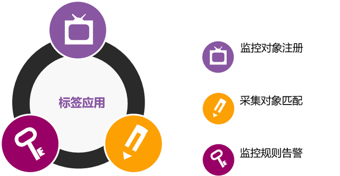针对每类监控对象我们都设计了监控标签,监控标签与一组标准监控指标和标准监控策略对应,我们称之为标准化监控规则。监控标签主要用于以下三个场景: