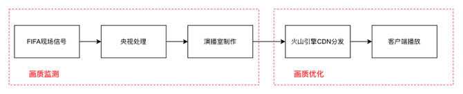 世界杯涉及链路较长,可简化为下图流程,FIFA 现场信号首先传到央视端进行合规安全处理,然后经过演播室的制作传输给 CDN 再进一步分发到用户侧。从画质角度来看整个链路可分为画质检测与画质优化两个部分,对于 CDN 之前的链路以画质监测为主,以发现问题/定位问题/推动对应链路人员解决问题为目的。画质优化在 CDN 和客户端两侧进行,下面的内容主要介绍画质优化部分。