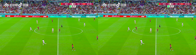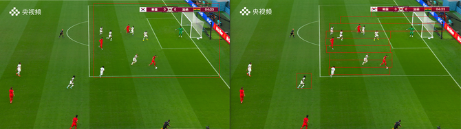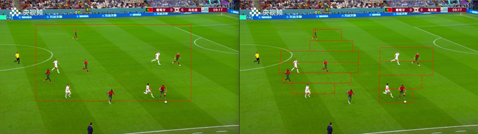 为了兼顾视频码率和主观画质,团队使用了基于 LSTM(长短期记忆网络)的时域 ROI 技术,通过人眼显著性区域检测和编码相结合的方式,让码率在画面上的分配更加合理。目前市面上没有专门针对足球场景的 saliency(显著性物体检测)数据集,通用的 saliency 数据集在世界杯这类特定场景中表现并不理想。针对这一问题,团队专门制作了足球场景的 saliency 数据集,通过眼动仪追踪球迷观看球赛时的关注区域得到足球比赛的专用 saliency 数据集,从而极大增加了模型的准确性。针对足球场景中显著性物体较多,显著性区域分散的特点,团队对检测模型进行了专门的优化,在保证检测速度的前提下,提高了模型的召回率和不同场景的鲁棒性,从而实现更优的主观质量。