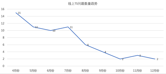 接入监控以来,通过双周稳定性周会的治理,归因于前端的TS问题数量不断的减少,在双十一和双十二大促期间,也持续的稳定在5个以下。