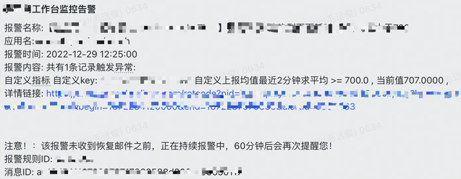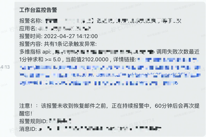 通过监控告警至少发现潜在的问题不少于5处,通过告警信息及时解决了潜在问题的风险,避免了线上问题的发生。这里举一个非常典型的接口超时告警的例子:获取用户标签信息接口超时告警