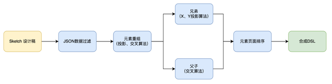 (3)问题3:“构建布局关系”是所有步骤中最复杂的一步,因为它涉及到许多技术难点,且几乎没有可供借鉴的开源资料。我们可能需要通过不断的尝试来解决问题。实际上,构建布局关系是基于之前提到的 JSON 数据进行 absolute 和 flex 关系的规整,然后对 DSL 进行递归渲染。具体实现过程可以参阅下文的布局核心算法设计。
