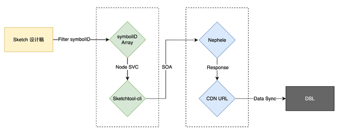 为此,我们使用一台预装了Sketch软件的Mac机器,并使用Sketchtool-cli处理设计稿中的图像、图标和路径。通过接收前端传递的图层symbolID,然后根据symbolID将设计稿中的图片导出并存储在本地磁盘中。接下来,前端会读取本地磁盘中的对应文件夹的图片,并通过接口调用的方式将图片上传到静态资源服务器。最后,服务器会返回可生产访问的CDN URL给前端,前端会将所有URL同步到DSL中。