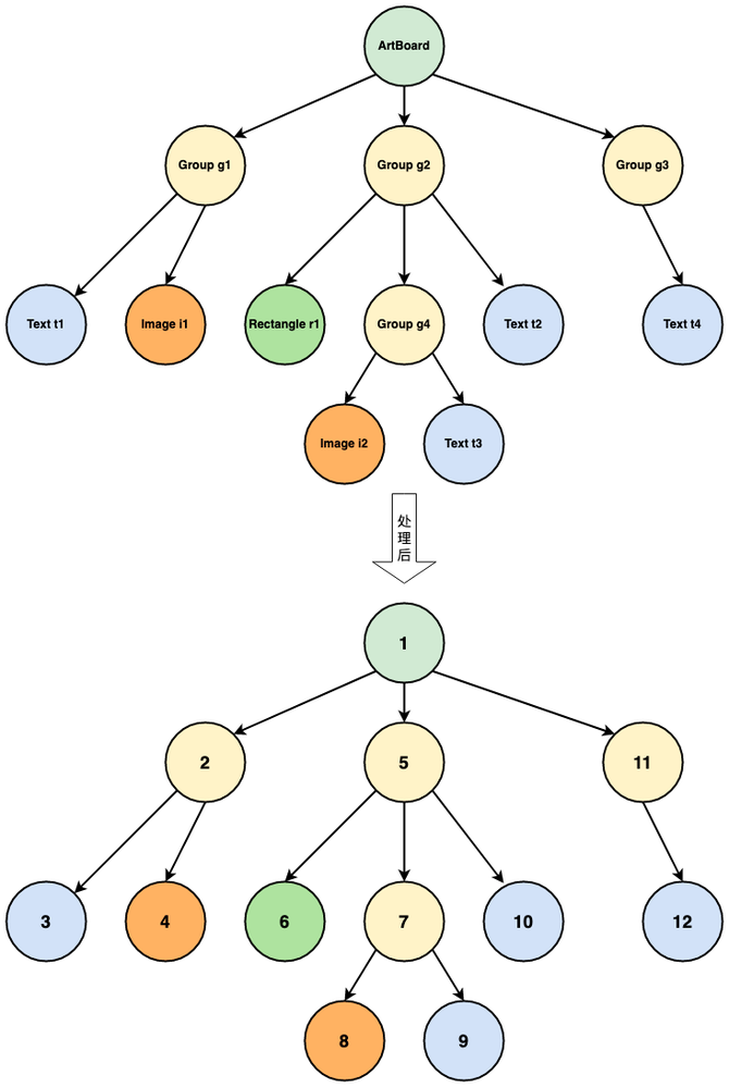 Order 层级深度推算:图层打平重组后,如何计算每个图层在DOM Tree中的层叠关系。我们可以根据初始JSON数据中的原始嵌套关系进行推算,为重组后的图层赋予新的层级深度值。
