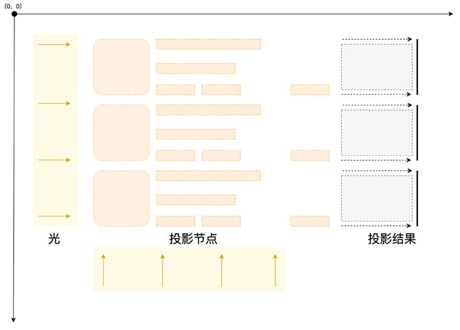 布局关系之兄弟关系,利用光影投射的原理,通过从X轴和Y轴的方向对其中的元素进行映射,投影后所在同一个阴影块内的元素,则构成了兄弟关系。兄弟关系算法的示意图: