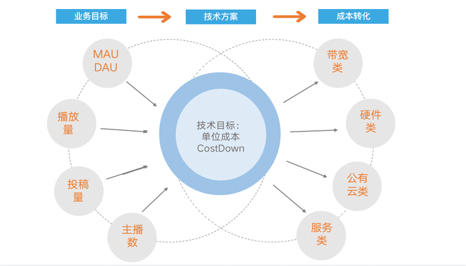 首先让我们来分析一下成本数据。B站的主要业务是点播、直播、电商、游戏等,做为一个以视频为主的网站,B站的每年IT成本花费中,带宽占比最大,其次是硬件,最后是公有云&其他IT服务类成本。想要做到成本优化的收益最大化,那么在各类成本资源项上都需要投入优化。