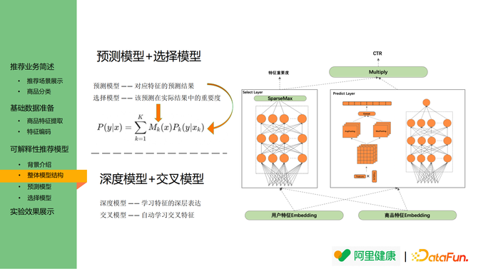 具体而言,预测模型用于预测对应特征预测/点击的概率,而选择模型则用于说明哪些特征分布是比较重要、可用于作为解释性文字的展示。