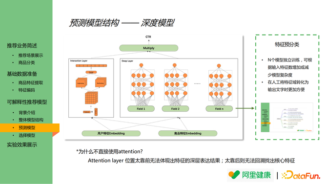 深度模型中,先提前对特征进行分组(假设共有 N 组),如对价格、类别等相关的特征合并为价格、类别大类(图中 field 字段),并对每一组特征进行单独的模型训练,并得到基于该组特征的模型结果。