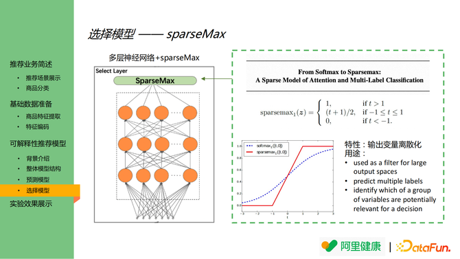 选择模型由 MLP 和 sparseMax 组成。值得一提的是,选择模型中激活函数采用的是 sparsemax 而不是更为常见的的 softmax。图像右边依次是 sparsemax 的函数定义及 softmax 与 sparsemax 的函数对比图。