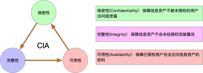 我们安全建设的目标是:保障信息资产的保密性(Confidentiality)、完整性(Integrity)、可用性(Availability):