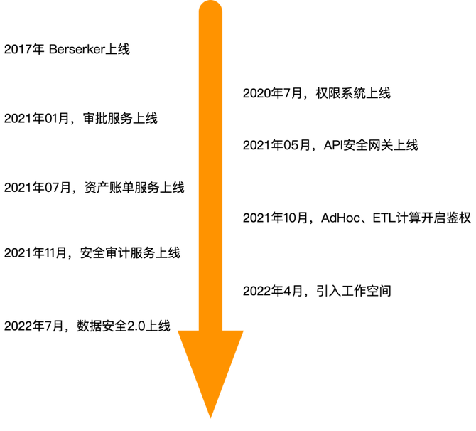 2020年7月数据安全的第一个服务权限系统从Berserker平台独立出,2022年7月,数据安全升级到2.0,中间经历了几次重大变更。