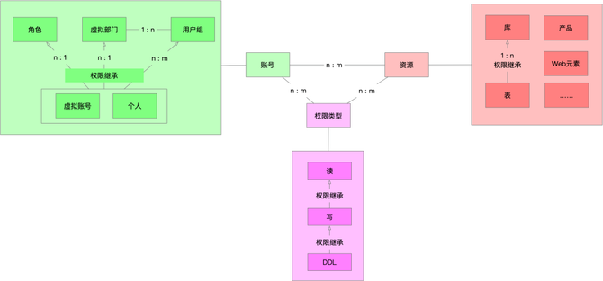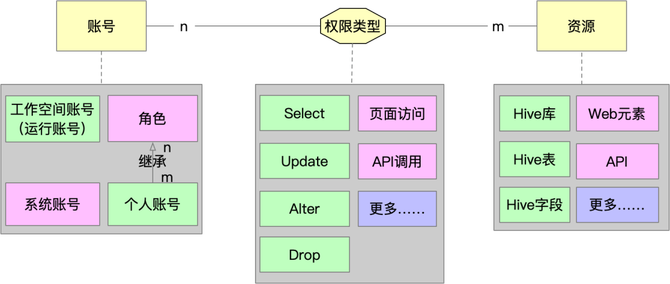本质上,权限主要包含三个部分:账号、资源和权限类型。相比于1.0,权限2.0对这三块在设计上较大改变,主要体现在:
