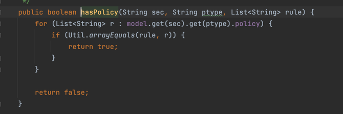 我们做权限迁移时,需要在Casbin中加载所有的权限策略,我们发现,Casbin加载性能很低,通过Debug后将问题定位在hasPolicy的实现上。