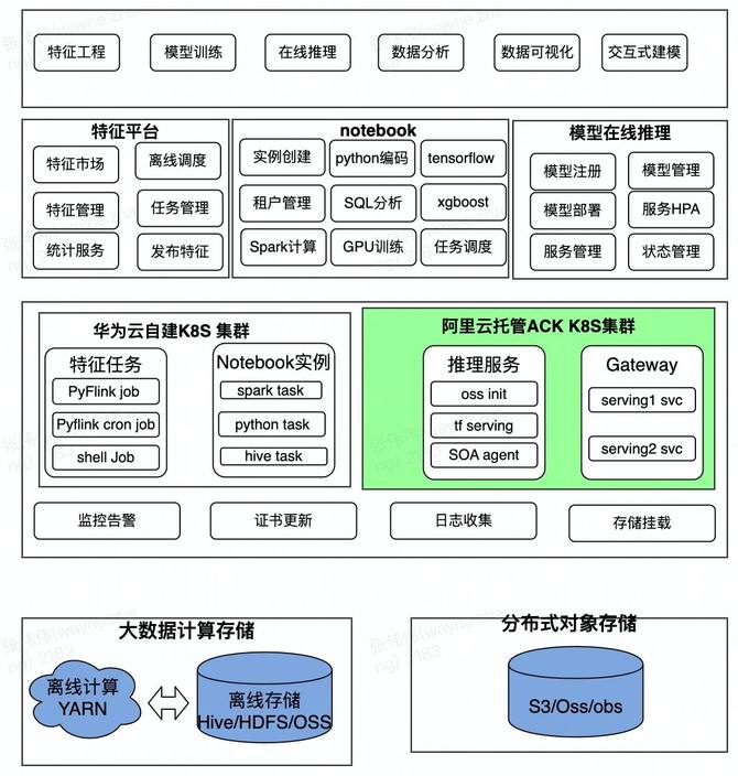 数据工程、模型训练、在线服务是机器学习技术实现的三驾马车,这个流程中处理的数据量大,计算量大、训练框架和版本多样、底层依赖复杂,资源算力管理,需要人工介入解决很多问题,给AI落地带来了比较困难。针对这一系列的问题,货拉拉大数据智能平台组从2020年开始就在探索提供一套完整的云原生的一站式AI解决方案,并从那时起就自建了Kubernetes 集群,后续提供了GPU按量训练能力、划分独立资源池纳管了其它部门机器,围绕着K8S平台完善了监控告警、容器日志收集能力,打通了大数据底层存储,引入OBS、S3对象存储,保证大数据AI化业务能稳定运行于K8S云原生底座上。