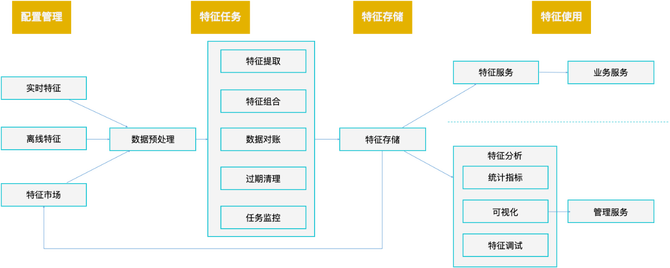特征平台主要是给数据科学家、数据工程师、机器学习工程师去使用,能够解决数据存储分散、特征重复、提取复杂、链路过长、使用困难等问题。主要功能是把数据从Hbase、Hive、关系型数据库等各类大数据ODS(Operational Data store )层进行快速的数据 ETL ,将数据抽取到ES、Redis、HBase、Hive,元数据在特征平台进行管理,并统一了数据出口,用来做算法模型的数据测试、训练、推理及其它数据应用。