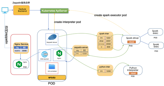 1. Zeppelin服务的启动,停止和状态获取,这块主要包含调用k8s Api去创建Namespace、ConfigMap、Service、RBAC、PV、PVC以及Zeppelin Server Deployment等Zeppelin启动相关的k8s对象,这里我们做了相关个性化开发,首先是通过调用JAVA K8S API去创建Zeppelin K8S对象,其次就是通过挂载NFS或S3解决 notebook 无法持久化存储问题、接着就是另外新增init container容器去实现多个用户demo note的拷贝操作,其中还会涉及以configmap和环境变量 实现相关动态参数的传递。