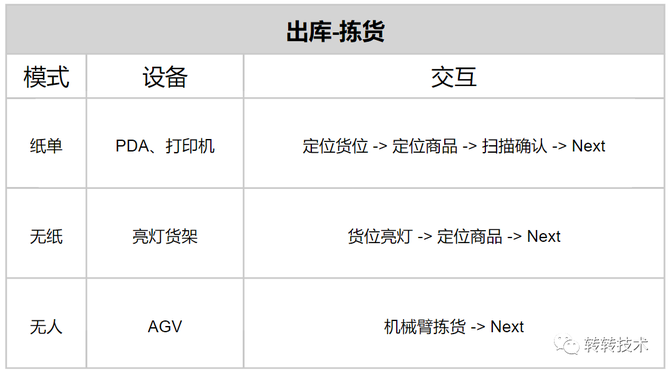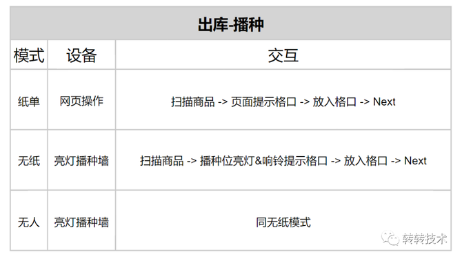 出库业务指的是商品执行出库发货任务并扣减库存的流程,其人工操作主要流程:拣货 -> 播种 -> 复核;对于这三个节点我们分别增加了对应的自动化设备,下面是不同模式下的对比: