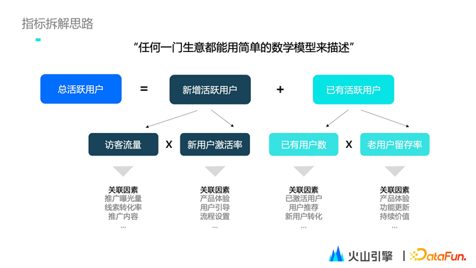 找到北极星指标之后,如何利用它?这个时候就需要按照关联因素再逐步拆解。我们日常讲任何生意都能用简单的数学模型来描述,包括活跃用户数就可以拆成新增活跃和已有活跃,新增活跃又可以拆成访客流量、新用户激活率,已有用户可以拆成已有用户和老用户的留存率。