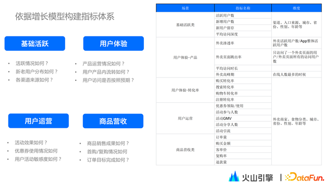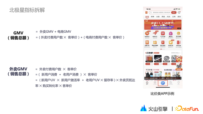 以火山引擎服务过的一家企业为例,其商业模式是返现业务。它会把用户导流到各大电商平台或者是外卖平台,如果用户从它这里跳转到外卖平台或者是电商平台完成了下单之后,可以从这个 APP 拿到平台那边的返佣。以这样的一个业务为例,GMV 就是他们的北极星指标。因为 GMV 越高,拿到的抽成越多,同时又因为它主要的业务板块是外卖和电商,所以可以把 GMV 拆成外卖 GMV 加电商 GMV,外卖的 GMV 是外卖的付费用户数乘以客单价。对外卖 GMV 再做一层拆解,付费用户数可以分为新用户、老用户,新用户消费可以拆成新用户 UV,新用户激活率,老用户消费拆成老用户 UV、留存率,以及外卖抵达率和购买转化率和客单价。当然也可以有其它的拆解思路。最关键的就是要把它拆成一个个关联影响因子,这个因子能够和日常的工作关联起来,能够把指标拆解到具体的业务方向上,才能够知道一旦这个指标出了问题,要做什么动作,才可能去优化这个指标。接下来就要去搭建指标体系。
