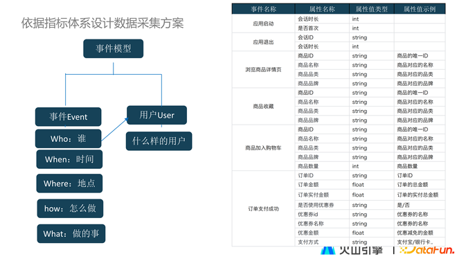 以火山引擎的增长分析(DataFinder)为例,火山引擎的行为分析数据,产品的底层模型有一张事件表一张用户表,事件表用来存储用户的事件,用户来到我们的 APP 会发生用户启动浏览、购买等行为,我们把用户的一种或者是一类行为抽象成一个个事件,同时在动作发生时用来描述这个事件信息的,我们把它叫做事件的属性。用户表是存储描述用户本身的信息,比如注册时间、VIP 等级。通过这两张表就可以完整的获取到我们想要的指标,就可以描述出一个用户在什么时间、什么地点,以什么样的形式做了一件什么事。埋点方案的示例可以参考上图右侧。
