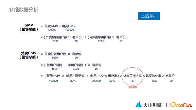 我们再回到最初构建的指标拆解模型。图中数据已经做了脱敏,可以明显地看到哪个指标有优化的空间,非常明显是外卖业的抵达率,这就相当于总流量的不到 10%,所以很多流量白白浪费了,所以我们要针对这块进行优化。另外,新用户的激活率 20%,也有很大的用户空间。
