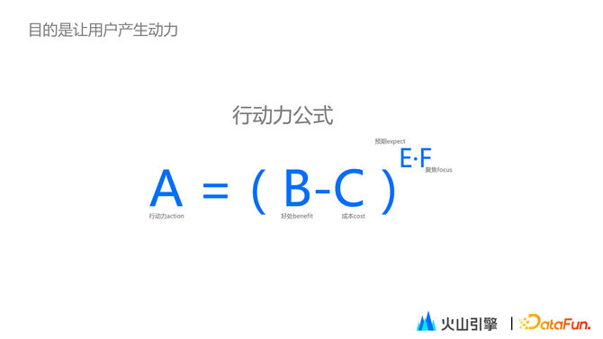 用户的动力就等于他在页面感知到的好处,减去感知到的成本。比如上文提到的外卖返现业务,着陆页投放的核心主旨是新用户注册就可以领 99 元无门槛优惠券,在这个场景里,用户感知到的好处就是 99 块无门槛优惠券,需要付出的成本就是输入手机号并且输入验证码,然后注册成为用户。E 乘以 F 的幂次方,指的是展现的信息,与用户进来这个页面时候的预期是否相吻合。比如我进来的时候,通过前一个页面进来的时候我想看到的就是无门槛优惠券,但进来之后有很多繁杂的规则,那么就不符合我的预期,这时就可能起了一些反作用。所以当呈现给用户的信息越符合用户的预期,并且信息的聚焦度越高,那么用户的行动力就会越强。