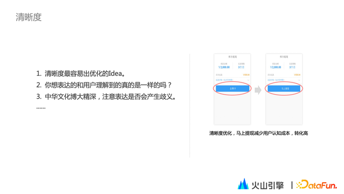 清晰度是最容易出优化文案的,改一个文案,改一个图片,改一个图标,改一个按钮的颜色非常的简单,可能带来意想不到的效果。另外需要注意的一点是,文案不要有歧义,要做到真诚、清晰地表达,减少用户的认知成本。