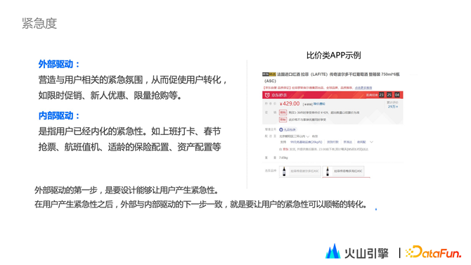 关于紧急度,有两个部分,一部分是外部驱动,还有一部分是内部驱动。外部驱动其实是营造与用户相关的紧急氛围,比如限量、限购其实就是塑造一种紧急度。另外一种就是内部驱动,确实是紧急需要的,是刚需。