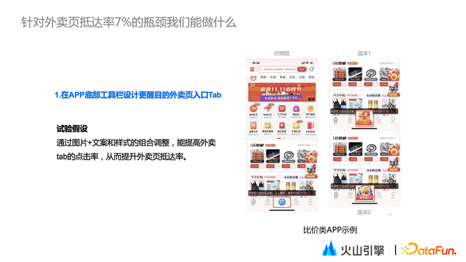 针对外卖页抵达率 7% 的瓶颈,我们在火山引擎 A/B 测试(DataTester)中开了 3 个实验,第一个实验是针对入口,去提供更加醒目的外卖页的入口 tab,原版本的入口 tab 是饿了么和美团外卖的图标,只有图标没有文字。优化后的版本,一个是以红包的形式,加文案“外卖返现”,二是加 1 个汉堡加可乐,加上点外卖的文案。通过这样的调整来提高外卖 tab 的点击率,从而提升外卖页抵达率。