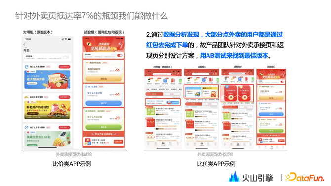 第二个实验是,通过前面的数据分析发现,绝大部分用户通过红包去完成下单。前文中提到过用户领的红包到底有没有用,绝大部分用户可能在有红包的时候下单的动力更强,所以说明大家对红包很在意。所以针对外卖的承接页和返现页分别设计了优化方案,用 A/B 测试来找更优版本。我们先看这个承接页,你看它一开始的时候其实是 3 个图片,大块的图片,它的配图文案以及按钮都不太清晰。