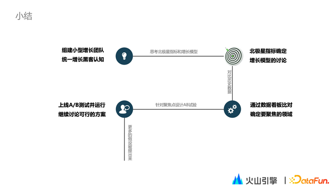 最后总结一下我们的整个体系。首先我们会去搭建一个小的增长团队,也就是虚拟小组,比如产品、数据分析开发就可以了。之后,同步一下增长黑客的认知,我们整理出北极星指标,指标差异拆解完之后,通过数据看板去比对增长瓶颈到底在哪里,哪个指标是现阶段最紧迫要提升、要优化的。聚焦这一领域去做 A/B 测试,定期去做实验数据分析,然后去设计更多的实验方案。
