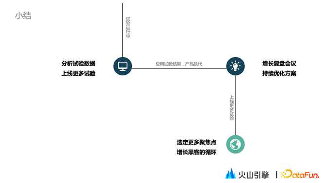 总结一下,先构建指标的增长体系,再找到瓶颈,然后再去设计增长策略、迭代方案,再通过 A/B 实验找到更优的那个效果,不断循环。