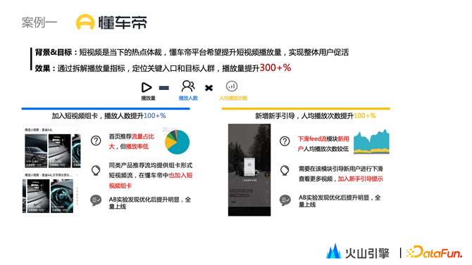 第一个案例是懂车帝,他希望能够提升短视频的播放量,实现整体用户的促活。我们把播放量拆成了播放人数和人均播放次数。播放人数可以按照不同的入口拆解,最终找到的瓶颈是首页推荐流量非常大,但是播放量比较低。我们也参考了同类竞品,加入了组卡形式。然后发现整个的提升效果非常明显。