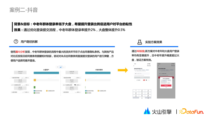 再来看抖音的案例,也是希望提升登录率,登录率又按照不同的用户群体去拆分,发现中老年群体的登录率低于大盘,所以这个时候需要对这块做一个整体优化。根据中老年群体的登录率,我们又找到了其登录转化漏斗发现最大的流失环节是在同一隐私条例这块。
