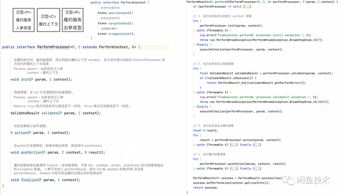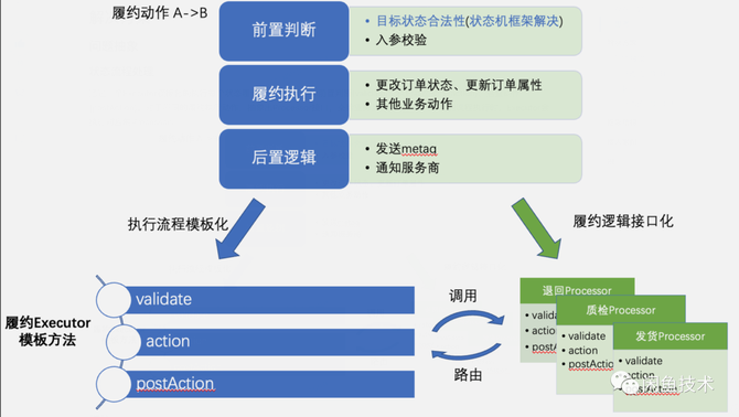 这几个操作,都是每个状态的履约中,可以抽象的操作步骤,是不变的点。每个步骤中的实现细节,是根据不同业务变化的点。那么,我们将不变的流程模板化、将变化的逻辑接口化。