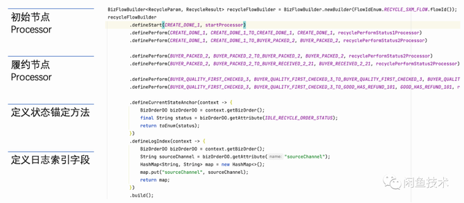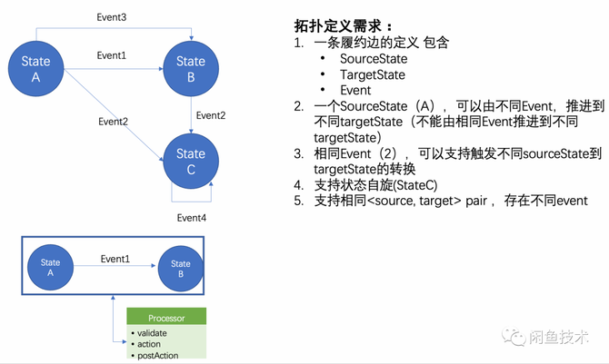 我们期望定义一个简明易用的API,来将状态拓扑以及履约处理器串联在一起,完成整个状态机的定义,示意如下: