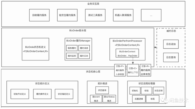 框架包含三层:核心层、胶水层、业务层。核心层提供纯粹的状态机定义、拓扑构造、执行引擎等能力,设计的薄一些,控制架构防腐化;胶水层引入中台订单查询、更新等能力,相对厚一些,简化业务适配成本、优化业务流程。业务层则基于通用的框架接口,面向业务应用,提供表达能力。