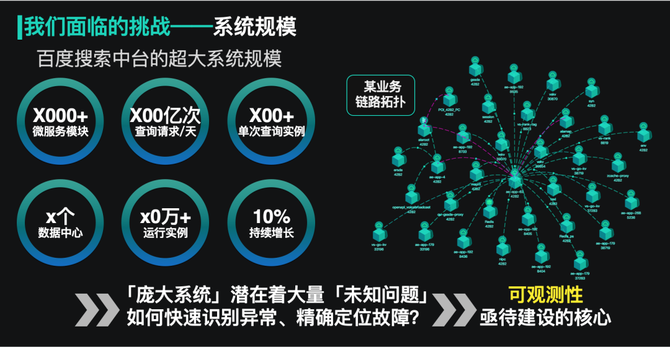 随着微服务化等技术的使用和新业务的接入,百度搜索中台的服务和实例规模不断增加,服务间的链路关系也日趋复杂,在这样一个庞大系统中建设可观测性,也面临着更多的挑战。