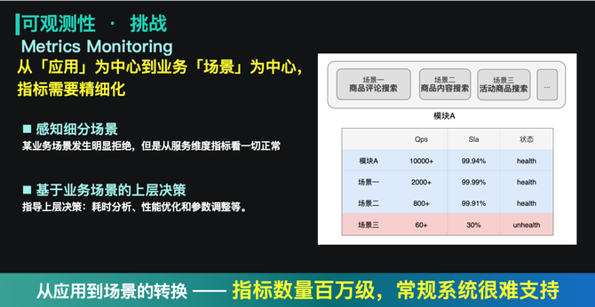 随着搜索中台业务场景的不断丰富,我们的观测视角也在发生着变化。过去更多关注的是应用维度的信息,而现在一个应用里可能有几十种业务场景,不同场景流量的规模是完全不同。如果只关注应用维度的指标,便可能在一些场景异常时,上层无法感知。如下图就是一个典型的例子:场景三的流量因为较小,无法从应用级别的指标中提现,因此在异常发生时,监控没有报警。同时,这种细分场景的指标也可以辅助上层做一定的决策,如不同的场景,其中一个场景通过同步加载,而另一场景通过异步加载,两者的超时要求是不一样的,这时候就可以通过这种细分场景的指标,指导我们做精细化的控制。