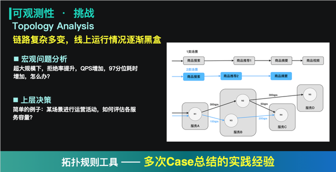 在云原生架构下,应用与应用之间的连接关系变得越来越复杂。分布式追踪可以帮助我们定位某个具体请求的问题。而在系统出现一些宏观问题:流量剧增,97分位耗时增加,拒绝率增加等,就需要拓扑分析工具帮助我们进行定位。同时它对上层决策也有比较强的指导意义。如下图右侧的例子:商品搜索有两类场景,第1类场景有运营活动,预计增加300qps的流量,如果没有拓扑分析工具的话,我们就很难评估各个服务的容量Buffer。