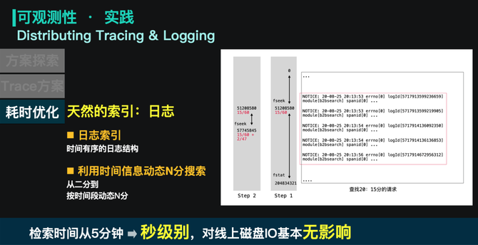 实例需要需要对自己的日志文件进行全量 grep,这在日志文件大、请求链路长的时候,会导致trace的时间较长,同时也会带来稳定性的冲击。这里我们使用了按时间动态N分搜索的思路,利用请求的时间信息和时间有序的日志结构,快速进行N分查找。