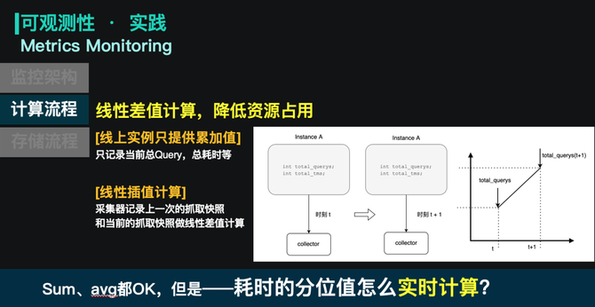 在这套架构里,我们对计算和存储进行了很多的优化,从线上指标变化到平台展现,只需要2s的反馈时间,资源开销非常轻量。以指标的聚合为例:线上实例只进行累加操作,而采集器会存上一次抓取的快照信息,和当前这一次采集做对比,进行线性差值计算。这种方式对线上实例的资源开销是肉眼不可见的。同时也可以方便的去产出Qps、延迟等信息。