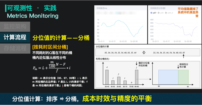 这样的好处是资源开销低,可实时计算,但是缺点是会损失一部分精度。这个精度取决于分桶的粒度,在搜索中台使用的桶大小是30ms,一般误差在15ms以内,可以满足性能观测的需求。